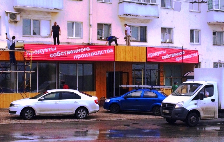 Светодиодные экраны размером 0.96*5.76 м и шагом пикселя 8 мм. в количестве 2 шт. изготовили и смонтировали для магазина "Ферма" в г. Уфа. Экраны работают синхронно.