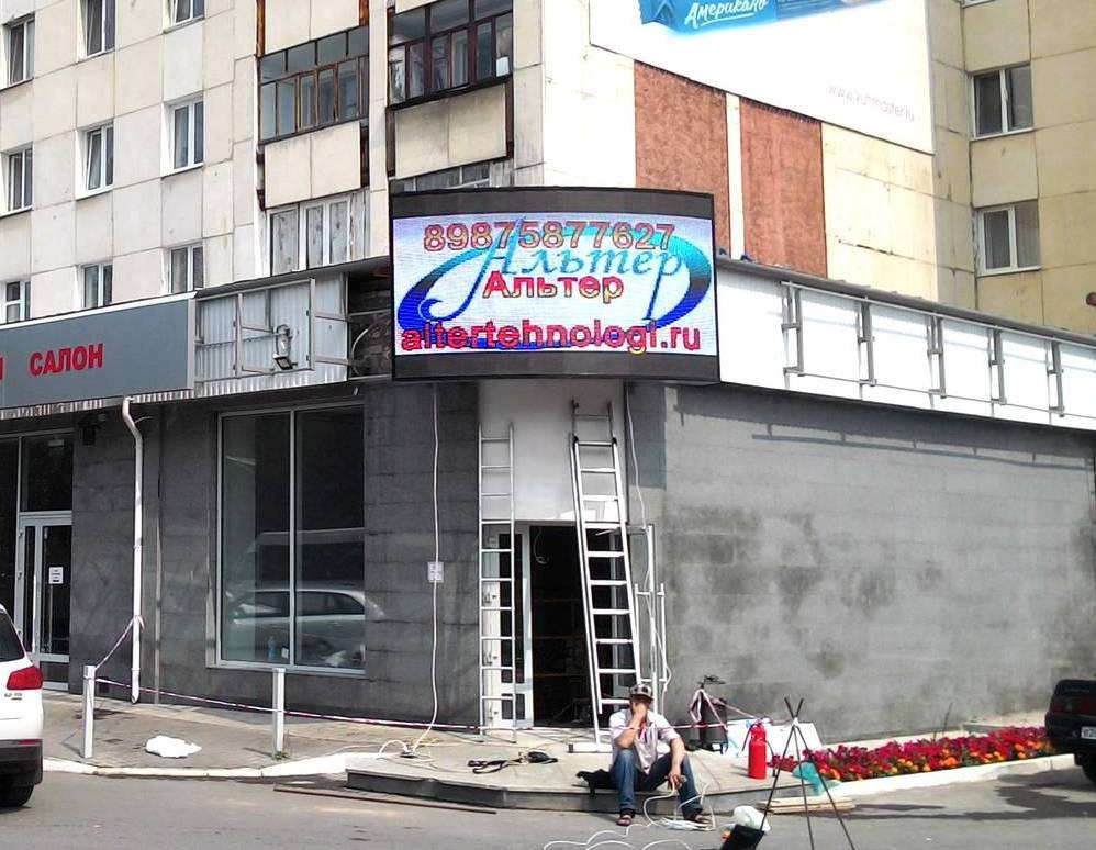 Экран размером 1.6*3.2 м, шаг пикселя 8 мм. изготовили и смонтировали над входом оружейного магазина "Totum". Видеоэкран по желанию клиента изготовлен в изогнутом виде