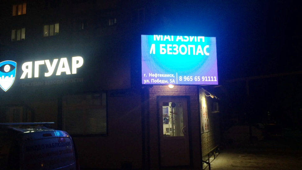 Установили видеоэкран размером 1.44*2.24 м с шагом пикселя 8 мм. на входной группе магазина систем безопасности "Ягуар" в г. Нефтекамск.